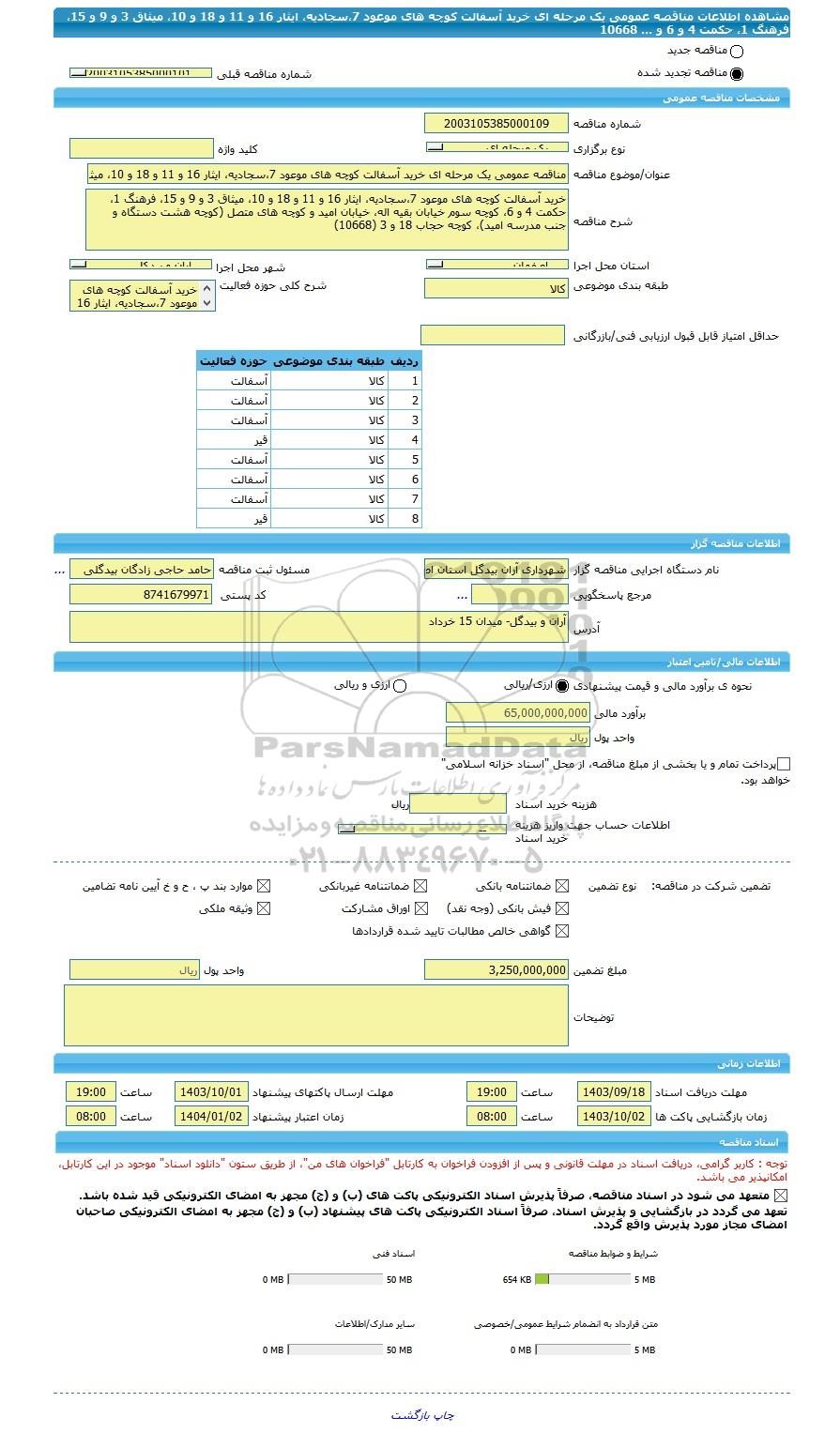 | شرح مناقصه | خرید آسفالت کوچه های موعود 7،سجادیه، ایثار 16 و 11 و 18 و 10، میثاق 3 و 9 و 15، فرهنگ 1، حکمت 4 و 6، کوچه سوم خیابان بقیه اله، خیابان امید و کوچه های متصل (کوچه هشت دستگاه و جنب مدرسه امید)، کوچه حجاب 18 و 3 (10668) | |||||||||||||||||||||||||||||