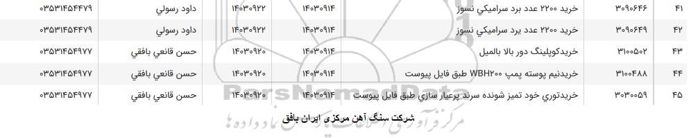 | 3100488 | خرید نیم پوسته پمپ WBH200 طبق فایل پیوست | 1403.09.20 | حسن قانعی بافقی | 03531454977 |