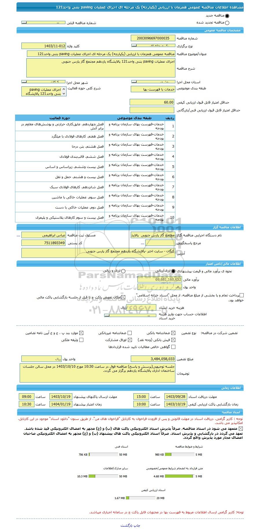 شرح مناقصهاجرای عملیات paving بتنی واحد121 پالایشگاه یازدهم مجتمع گاز پارس جنوبی