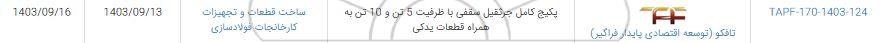 | TAPF 170-1403-124 | تافکو (توسعه اقتصادی پایدار فراگیر) | پکیج کامل جرثقیل سقفی با ظرفیت 5 تن و 10 تن به همراه قطعات یدکی | ساخت قطعات و تجهیزات کارخانجات فولادسازی | 1403.9.13 | 1403.9.16 |