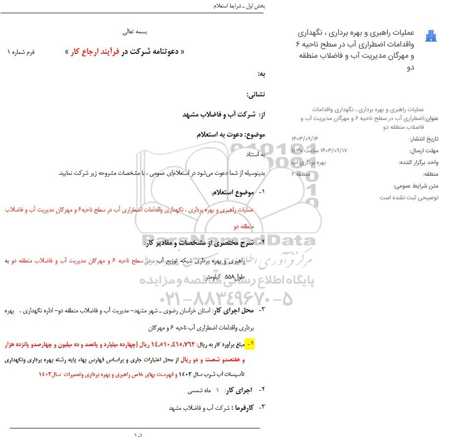 1- موضوع استعلام : عملیات راهبری و بهره برداری، نگهداری و اقدامات اضطراری آب در سطح ناحیه 6 و مهرگان مدیریت آب و فاضلاب منطقه دو