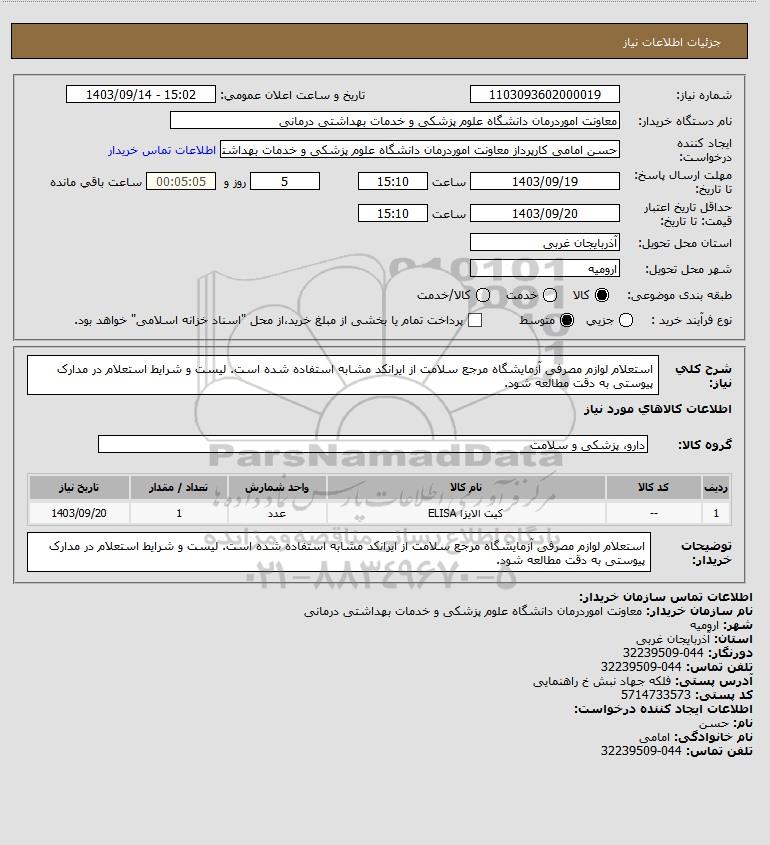 شرح کلی نیاز: استعلام لوازم مصرفی آزمایشگاه مرجع سلامت از ایرانکد مشابه استفاده شده است. لیست و شرایط استعلام در مدارک پیوستی به دقت مطالعه شود.