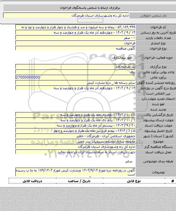 این مناقصه در تاریخ 1403/09/14 شروع و مهلت آن تا تاریخ 1403/09/20 میباشد.