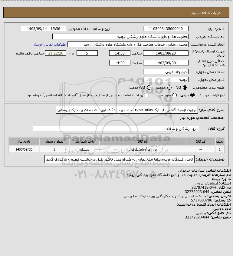 نام دستگاه خریدار:معاونت غذا و دارو دانشگاه علوم پزشکی ارومیه