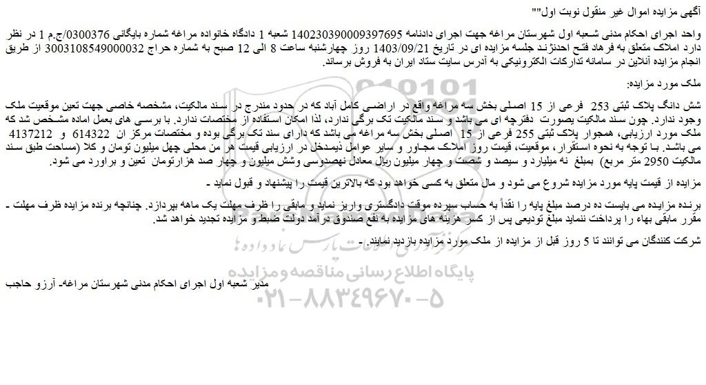 واحد اجرای احکام مدنی شعبه اول شهرستان مراغه جهت اجرای دادنامه 140230390009397695 شعبه 1 دادگاه خانواده مراغه شماره بایگانی 0300376/ج.م 1 در نظر دارد املاک متعلق به فرهاد فتح احدنژند جلسه مزایده ای در تاریخ 1403/09/21 روز چهارشنبه ساعت 8 الی 12 صبح به شماره حراج 3003108549000032 از طریق انجام مزایده آنلاین در سامانه تدارکات الکترونیکی به آدرس سایت ستاد ایران به فروش برساند.