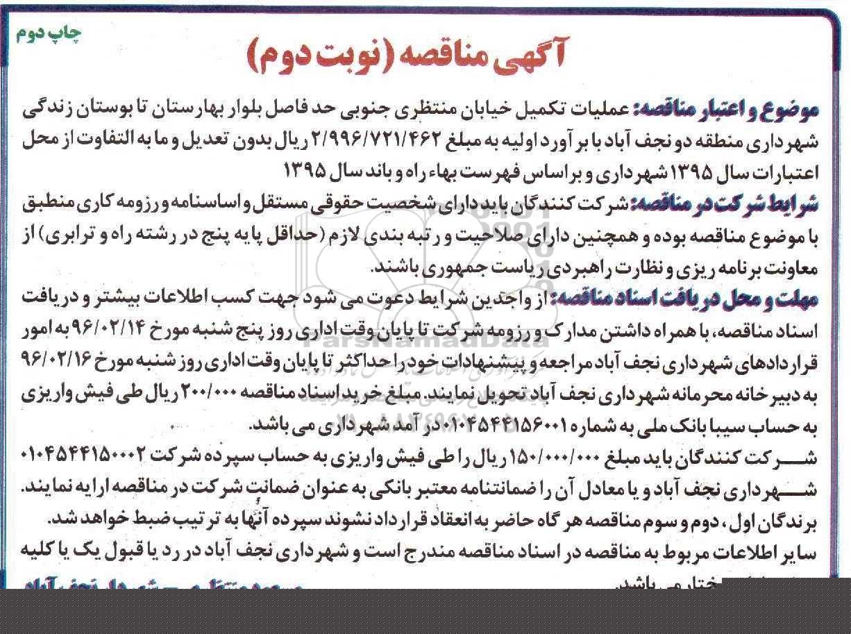 موضوع و اعتبار مناقصه: عملیات تکمیل خیابان منتظری جنوبی حد فاصل بلوار بهارستان تا بوستان زندگی شهرداری منطقه دو نجف آباد با برآورد اولیه به مبلغ 2.996.721.462 ریال بدون تعدیل و مابه التفاوت از محل اعتبارات سال 1395 شهرداری و بر اساس فهرست بهاء راه و باند سال 1395