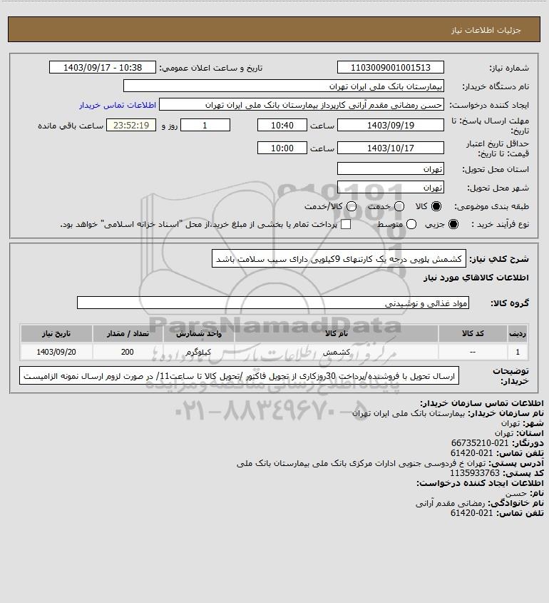 شرح کلی نیاز: کشمش پلویی درجه یک کارتنهای 9کیلویی دارای سیب سلامت باشد