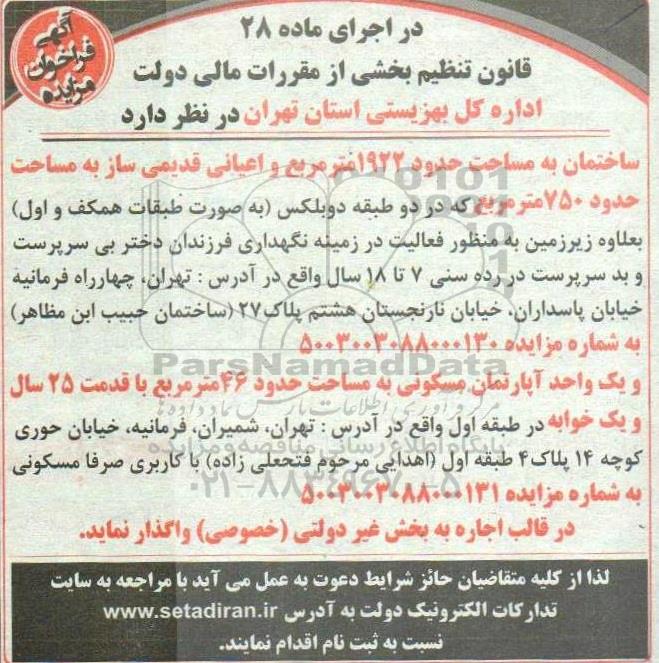 ساختمان به مساحت حدود 1922 متر مربع و اعیانی قدیمی ساز به مساحت حدود 750 متر مربع که در دو طبقه دوبلکس به صورت طبقات همکف و اول بعلاوه زیرزمین به منظور فعالیت در زمینه نگهداری فرزندان دختر بی سرپرست و بد سرپرست در رده سنی 7 تا 18 سال واقع در آدرس : تهران چهارراه فرمانیه خیابان پاسداران خیابان نارنجستان هشتم پلاک 27 ساختمان حبیب ابن مظاهر