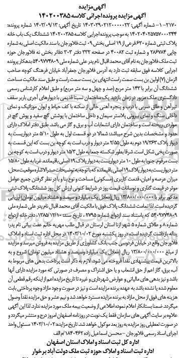 مزایده فروش یکباب خانه به مساحت 143 مترمربع پلاک ثبتی 620 فرعی از 19 اصلی