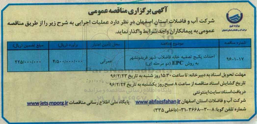 | 96-1-17 | احداث پکیج تصفیه خانه فاضلاب شهر فریدونشهر از به روش epc دو مرحله ای |