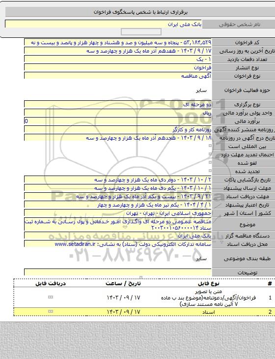 مناقصه عمومی دو مرحله ای واگذاری امور خدماتی و پول رسانی به شماره ثبت ستاد ۲۰۰۳۰۰۱۰۵۶۰۰۰۰۱۴