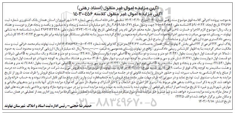 مزایده فروش پلاک ثبتی 222 فرعی از23 اصلی بخش 4 نهاوند استان همدان به مساحت 244/67 متر مربع به مبلغ 9.000.000.000 ریال
