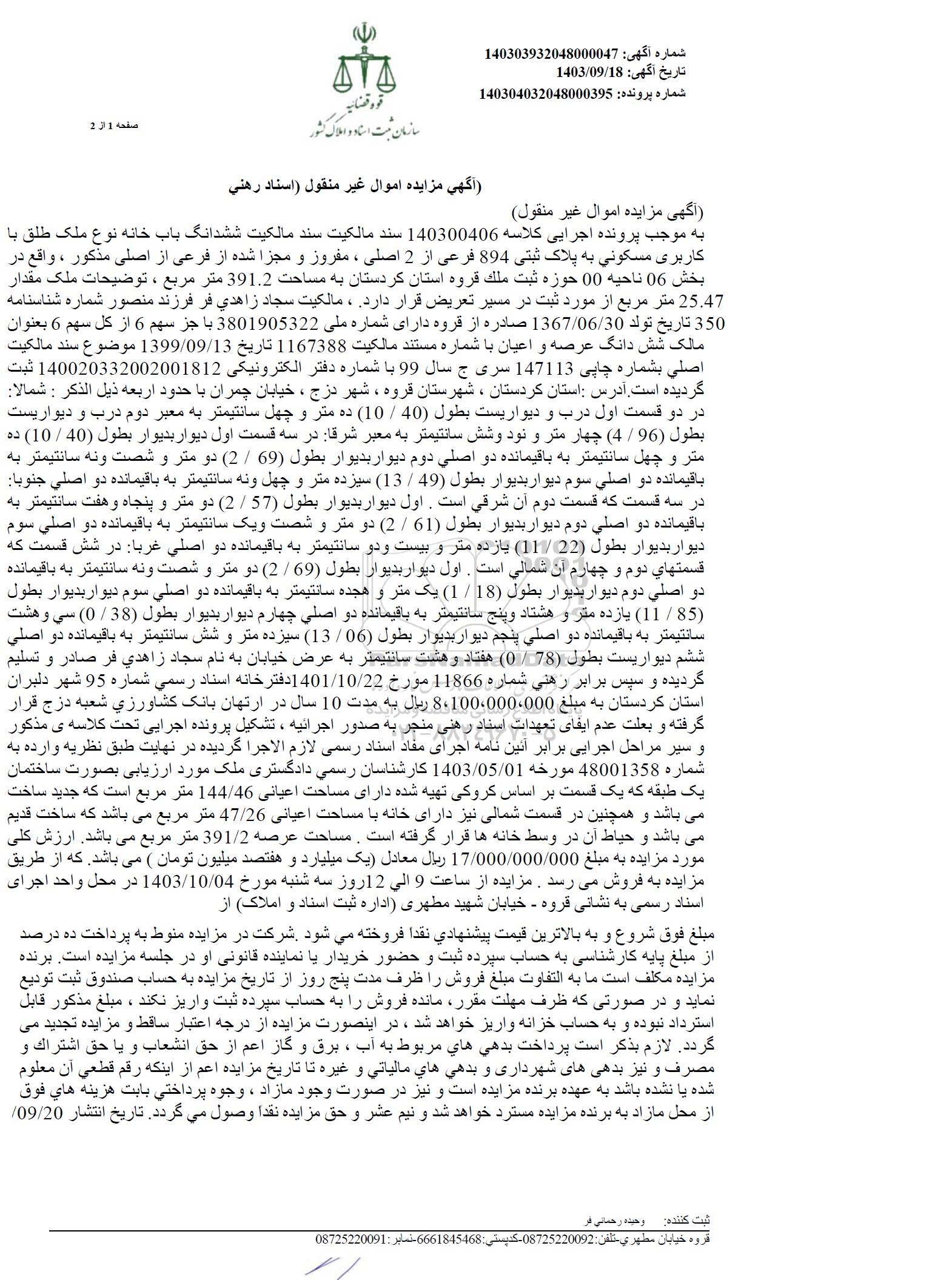 مزایده ششدانگ یکباب خانه مسکونی پلاک ثبتی 894 فرعی از 2 اصلی کلاسه 140300406