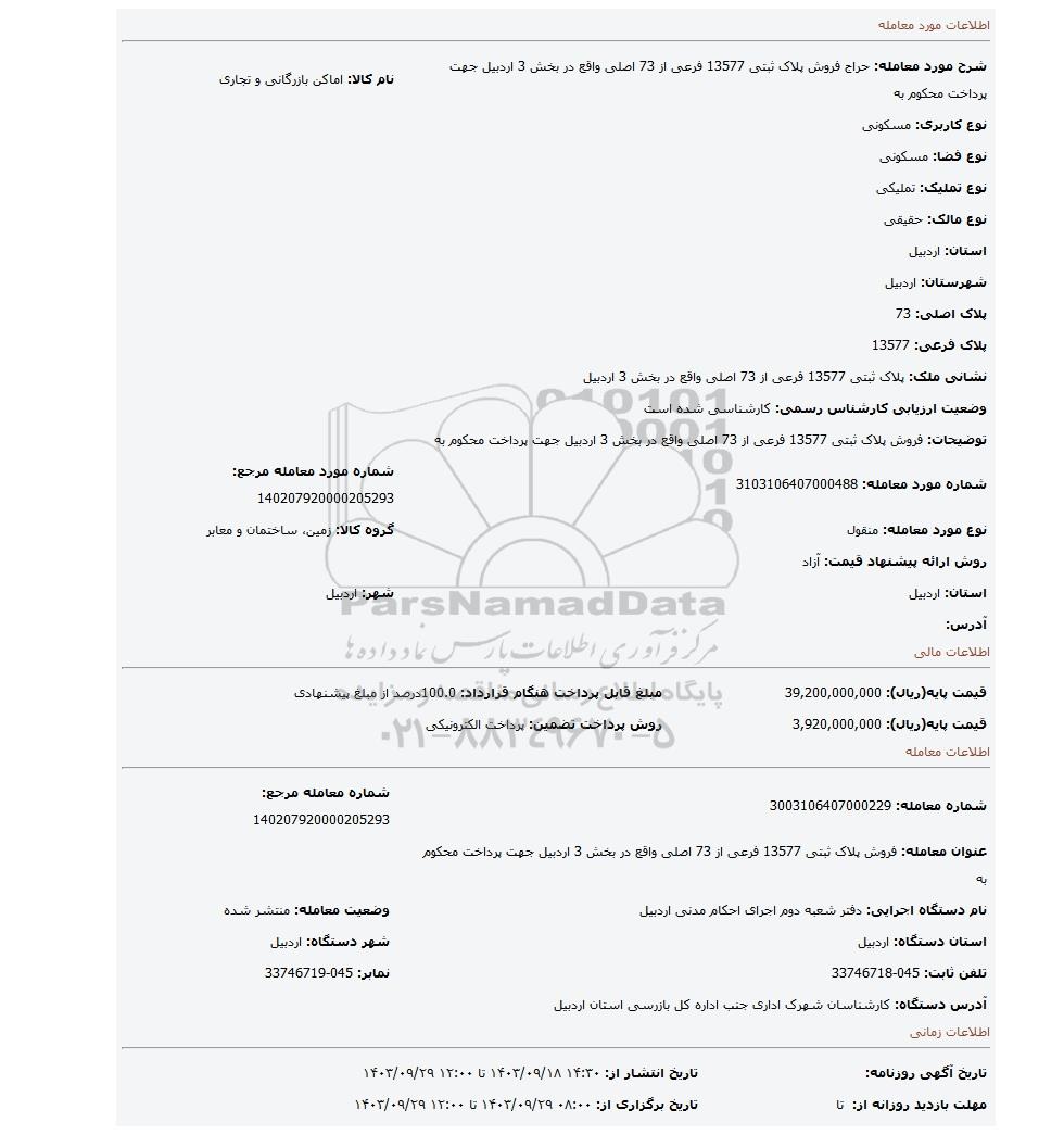 عنوان معامله: فروش پلاک ثبتی 13577 فرعی از 73 اصلی واقع در بخش 3 اردبیل جهت پرداخت محکوم به | ||