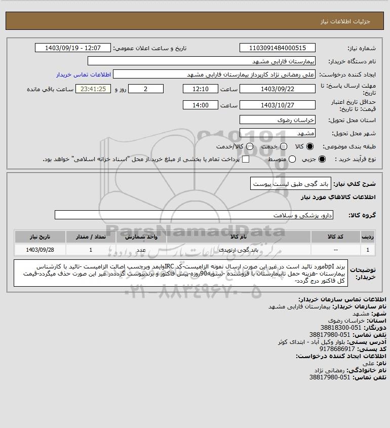 | 1 | -- | باند گچی ارتوپدی | عدد | 1 | 1403/09/28 |