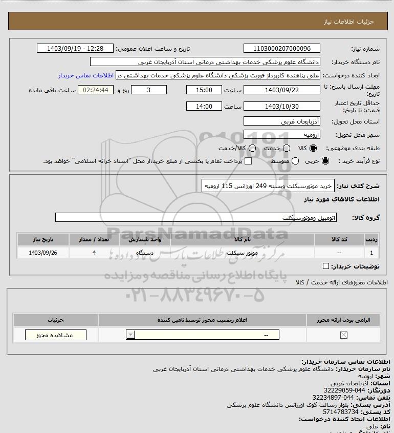 شرح کلی نیاز: خرید موتورسیکلت ویسته 249 اورژانس 115 ارومیه