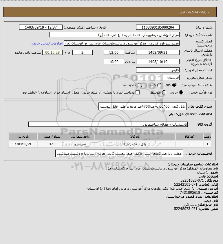 | 1 | -- | پانل سقف (تایل) | متر مربع | 470 | 1403/09/29 |