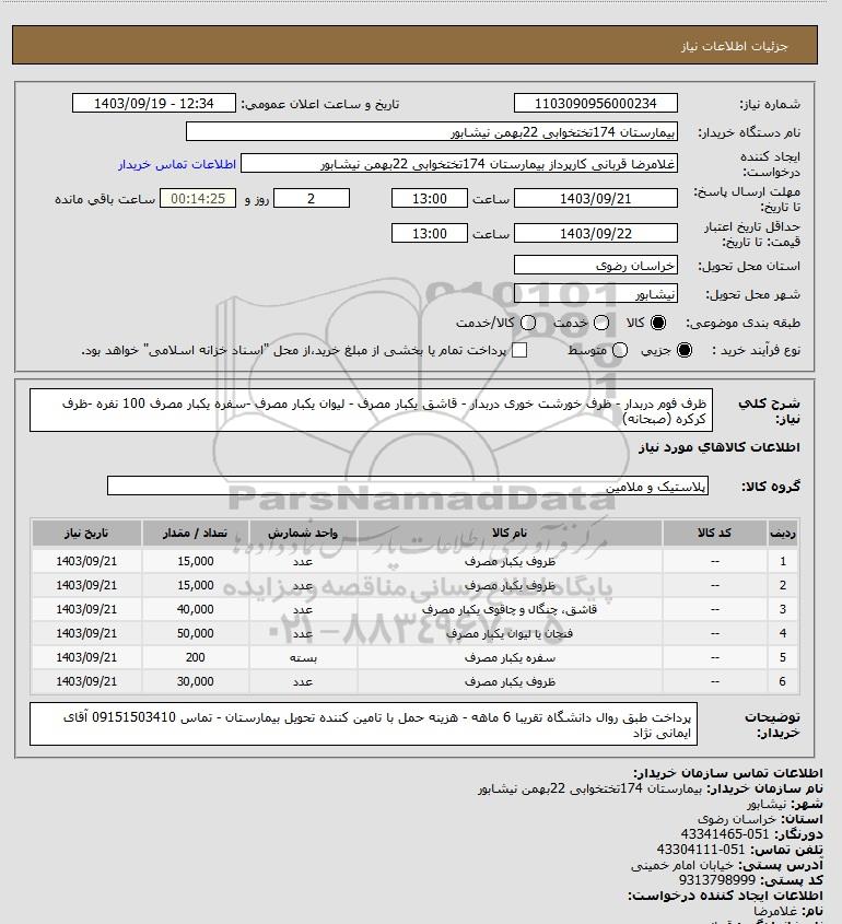 | 2 | -- | ظروف یکبار مصرف | عدد | 15,000 | 1403/09/21 |