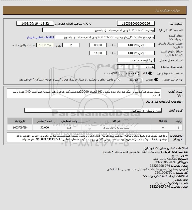 شرح کلی نیاز: ست سرم مارک(سوپا- پیک مد-ماد-مدد بخش-HD-)تعداد 30000عدد.شرکت های دارای تاییدیه صلاحیت IMD مورد تایید است.