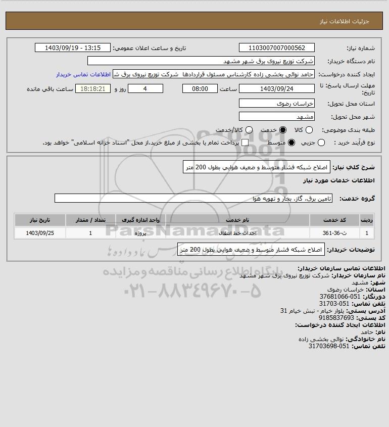 شرح کلی نیاز: ﺍﺻﻼﺡ ﺷﺒﻜﻪ ﻓﺸﺎﺭ ﻣﺘﻮﺳﻂ ﻭ ﺿﻌﻴﻒ ﻫﻮﺍﻳﻲ ﺑﻄﻮﻝ 200 متر