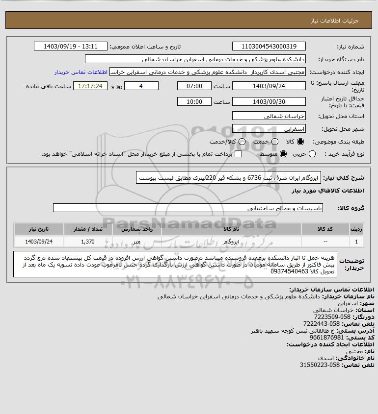 شرح کلی نیاز: ایزوگام ایران شرق ثبت 6736 و بشکه قیر 220لیتری مطابق لیست پیوست