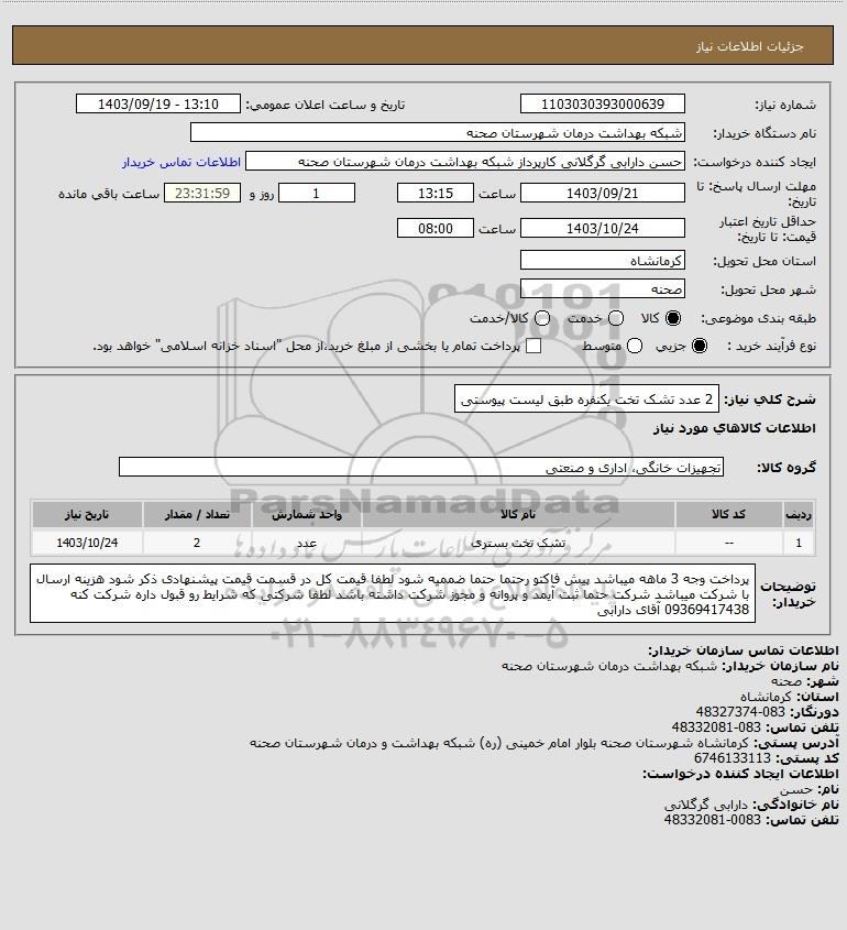 | 1 | -- | تشک تخت بستری | عدد | 2 | 1403/10/24 |