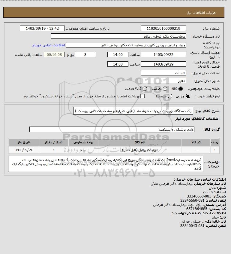 استعلام بها و موضوع استعلام استعلام یک دستگاه تورنیکت دیجیتال هوشمند (طبق شرایط و مشخصات فنی پیوست ) به اطلاع کلیه شرکت‌ها و افراد متخصص واجد شرایط می‌رساند، آگهی گذار در نظر دارد از طریق استعلام بها، نسبت به انتخاب و دریافت پیشنهادات اقدام نماید. این استعلام با کد آگهی ثبت شده در سامانه خبرگزاری پارس نماد : 8384624 منتشر شده است. مشخصات استعلام : تاریخ شروع استعلام: 1403/09/19 آخرین مهلت ارسال پیشنهاد قیمت : 1403/09/22 و محل اجرای پروژه : استان همدان میباشد. استعلام قیمت مورد درخواست : استعلام یک دستگاه تورنیکت دیجیتال هوشمند (طبق شرایط و مشخصات فنی پیوست ) با دسته‌بندی‌های تخصصی و گروه های مرتبط : خدمات و تجهیزات آزمایشگاهی و پزشکی, استعلام اطلاع رسانی میگردد.