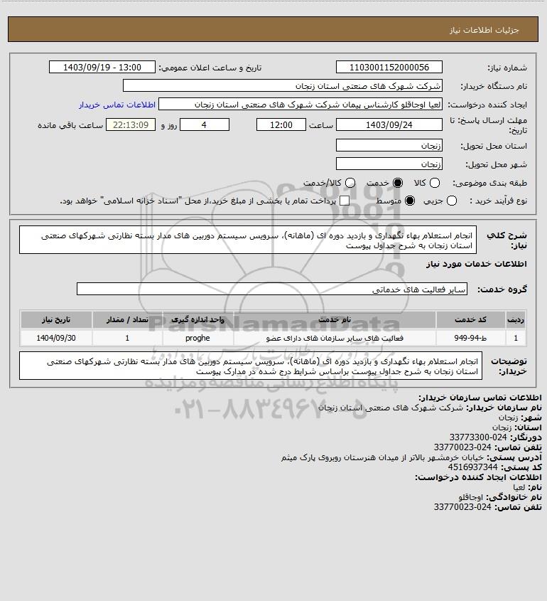 استعلام انجام استعلام بهاء نگهداری و بازدید دوره ای (ماهانه) سرویس سیستم دوربین های مدار بسته نظارتی شهرکهای صنعتی استان زنجان به شرح جداول پیوست, استعلام انجام استعلام بهاء نگهداری و بازدید دوره ای (ماهانه)، سرویس سیستم دوربین های مدار بسته نظارتی شهرکهای صنعتی استان زنجان به شرح جداول پیوست