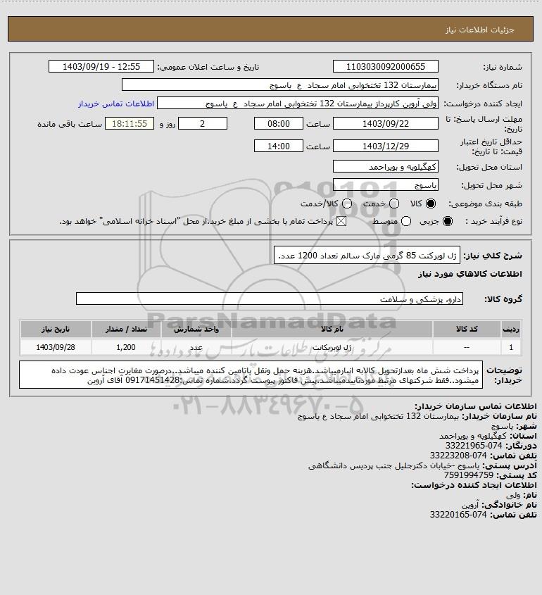 شرح کلی نیاز: ژل لوبرکنت 85 گرمی مارک سالم تعداد 1200 عدد.