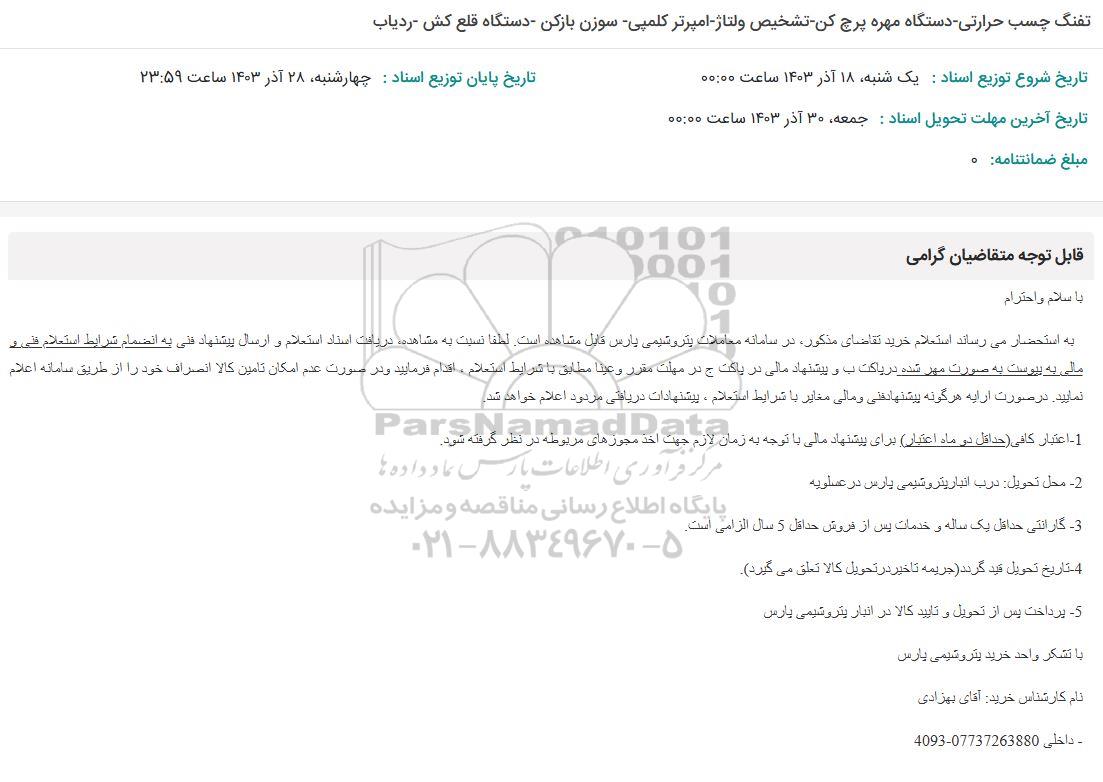 احتراماً استعلام خرید تقاضای مذکور در سامانه معاملات پتروشیمی پارس قابل مشاهده است. لطفاً نسبت به مشاهده دریافت استاد استعلام و ارسال پیشنهاد فنی به انضمام شرایط استعلامهای پیوست به صورت مهر شده در پاکت ب و پیشنهاد مالی در پاکت ج در مهلت مقرر و عینا مطابق با شرایط استعلام اقدام فرمایید و در صورت تقدم امکان تامین کالا انصراف خواد را از طریق سامانه استعلام نمایید. در صورت ارائه هرگونه پیشنهاد فنی و مالی مغایر با شرایط استعلام پیشنهادات دریافتی مردود اعلام خواهد شد.