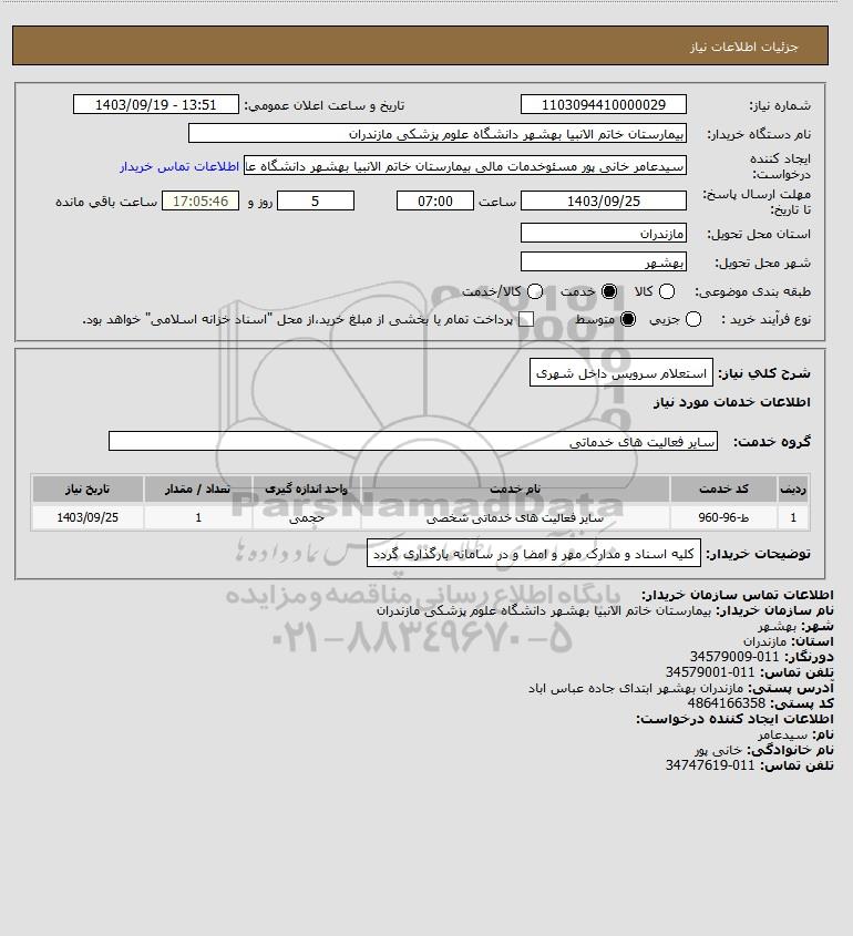 شرح کلی نیاز: استعلام سرویس داخل شهری