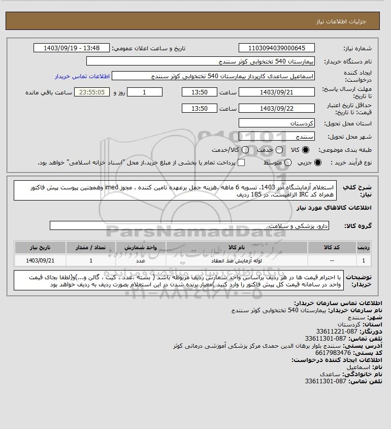 شرح کلی نیاز: استعلام آزمایشگاه آذر 1403. تسویه 6 ماهه .هزینه حمل برعهده تامین کننده . مجوز imed وهمچنین پیوست پیش فاکتور همراه کد IRC الزامیست. در 185 ردیف
