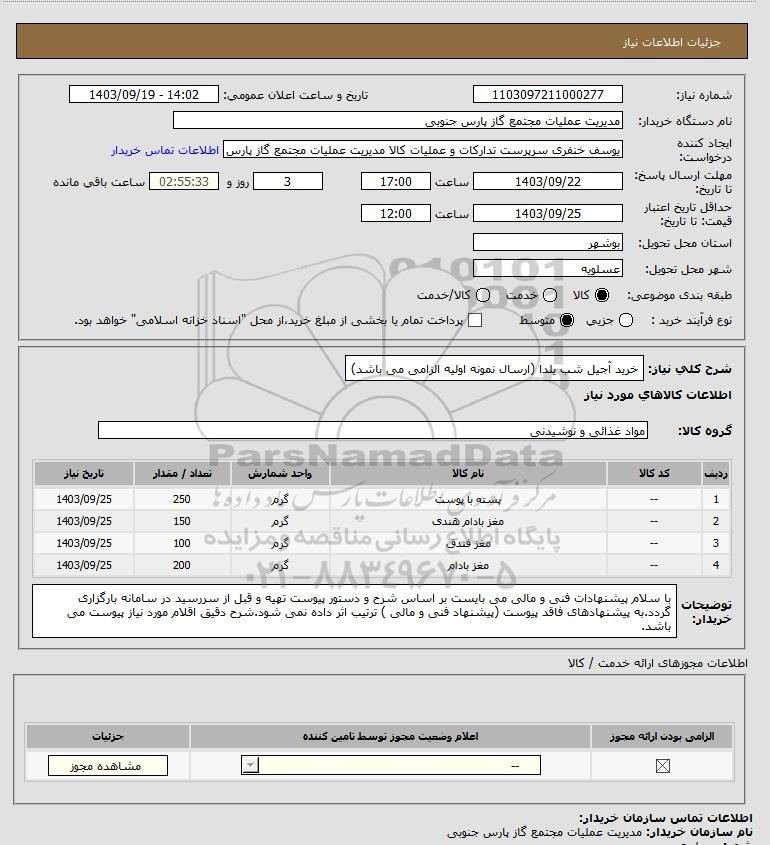 شرح کلی نیاز: خرید آجیل شب یلدا (ارسال نمونه اولیه الزامی می باشد)