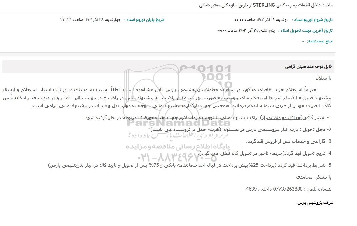 احتراماً استعلام خرید تقاضای مذکور در سامانه معاملات پتروشیمی پارس قابل مشاهده است. لطفاً نسبت به مشاهده دریافت استاد استعلام و ارسال پیشنهاد فنی به انضمام شرایط استعلامهای پیوست به صورت مهر شده در پاکت ب و پیشنهاد مالی در پاکت ج در مهلت مقرر اقدام و در صورت عدم امکان تامین کالا، انصراف خود رااز طریق سامانه اعلام فرمایید. همچنین جهت بارگذاری پیشنهاد مالی الزامی است.