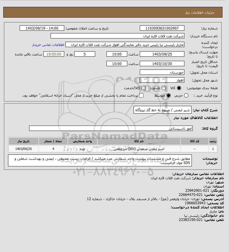 | 1 | -- | شیر ایمنی سطحی (SSV) سرچاهی | عدد | 4 | 1403/09/25 |