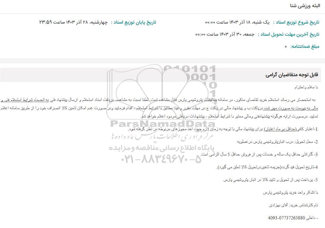 احتراماً استعلام خرید تقاضای مذکور در سامانه معاملات پتروشیمی پارس قابل مشاهده است. لطفاً نسبت به مشاهده دریافت استاد استعلام و ارسال پیشنهاد فنی به انضمام شرایط استعلامهای پیوست به صورت مهر شده در پاکت ب و پیشنهاد مالی در پاکت ج در مهلت مقرر اقدام و در صورت عدم امکان تامین کالا، انصراف خود رااز طریق سامانه اعلام فرمایید. همچنین جهت بارگذاری پیشنهاد مالی الزامی است.