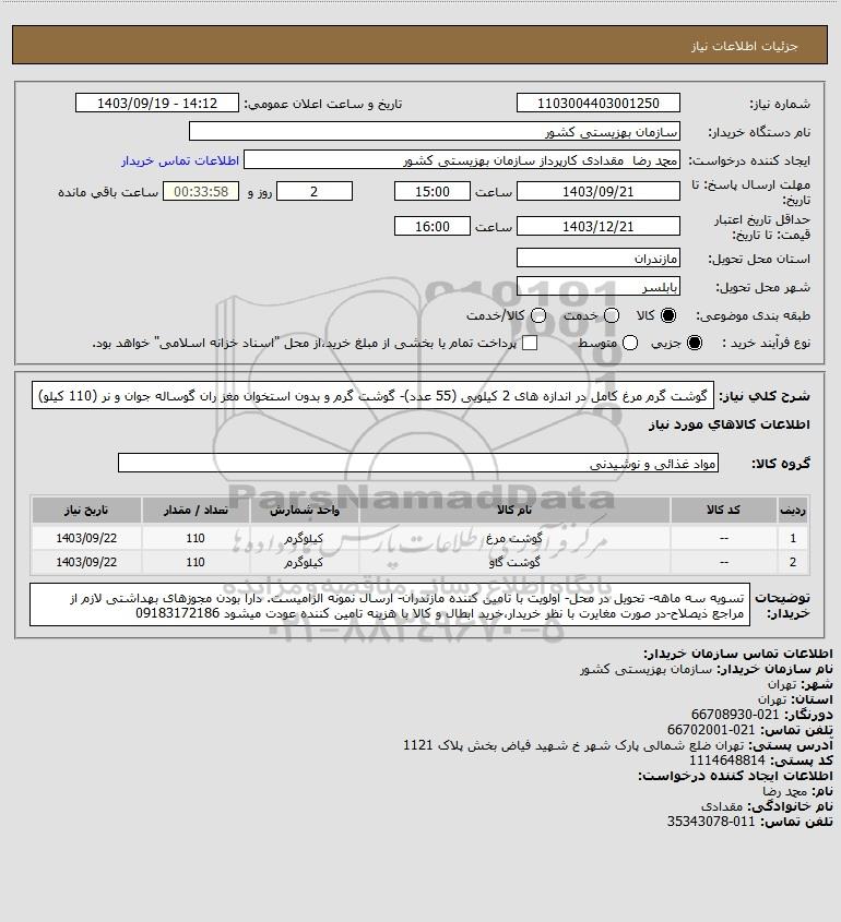 | 1 | -- | گوشت مرغ | کیلوگرم | 110 | 1403/09/22 |