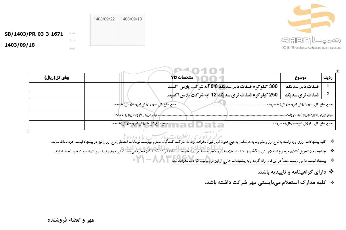 استعلام بها و موضوع استعلام استعلام فسفات دی سدیک به اطلاع کلیه شرکتها و افراد متخصص واجد شرایط میرساند، آگهی گذار در نظر دارد از طریق استعلام بها، نسبت به انتخاب و دریافت پیشنهادات اقدام نماید. این استعلام با کد آگهی ثبت شده در سامانه خبرگزاری پارس نماد : 8385106 منتشر شده است. مشخصات استعلام : تاریخ شروع استعلام: 1403/09/18 آخرین مهلت ارسال پیشنهاد قیمت : 1403/09/22 و محل اجرای پروژه : استان سایر میباشد. استعلام قیمت مورد درخواست : استعلام فسفات دی سدیک با دستهبندیهای تخصصی و گروه های مرتبط : مواد شیمیایی, مواد اولیه کارخانجات, استعلام اطلاع رسانی میگردد.