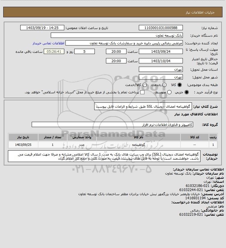 توضیحات خریدار:گواهینامه امضای دیجیتال (SSL) برای وب سایت های بانک به مدت 1 سال کالا اعلامی مشابه و صرفا جهت اعلام قیمت می باشد. خواهشمند است با توجه به فایل های پیوست، قیمت به صورت کلی و جمع کل اعلام گردد