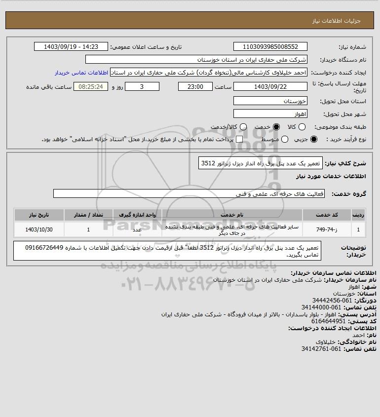 شرح کلی نیاز: تعمیر یک عدد پنل برق راه انداز دیزل ژنراتور 3512