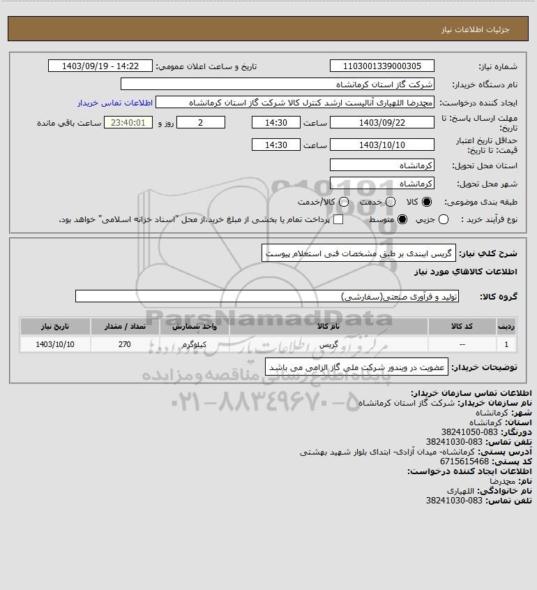شرح کلی نیاز: گریس اببندی بر طبق مشخصات فنی استعلام پیوست