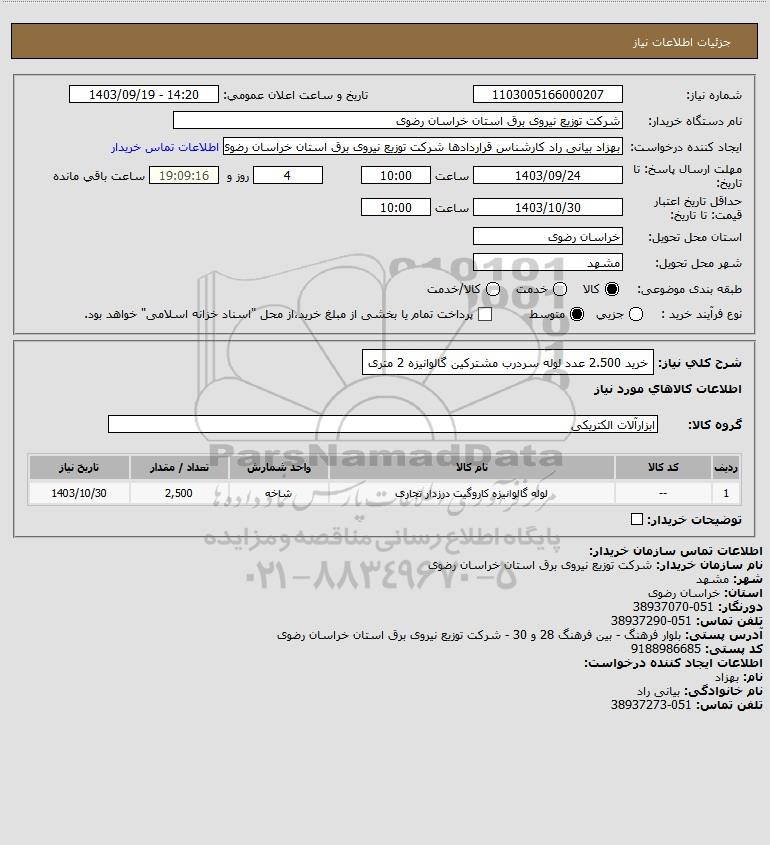 شرح کلی نیاز: خرید 2.500 عدد لوله سردرب مشترکین گالوانیزه 2 متری