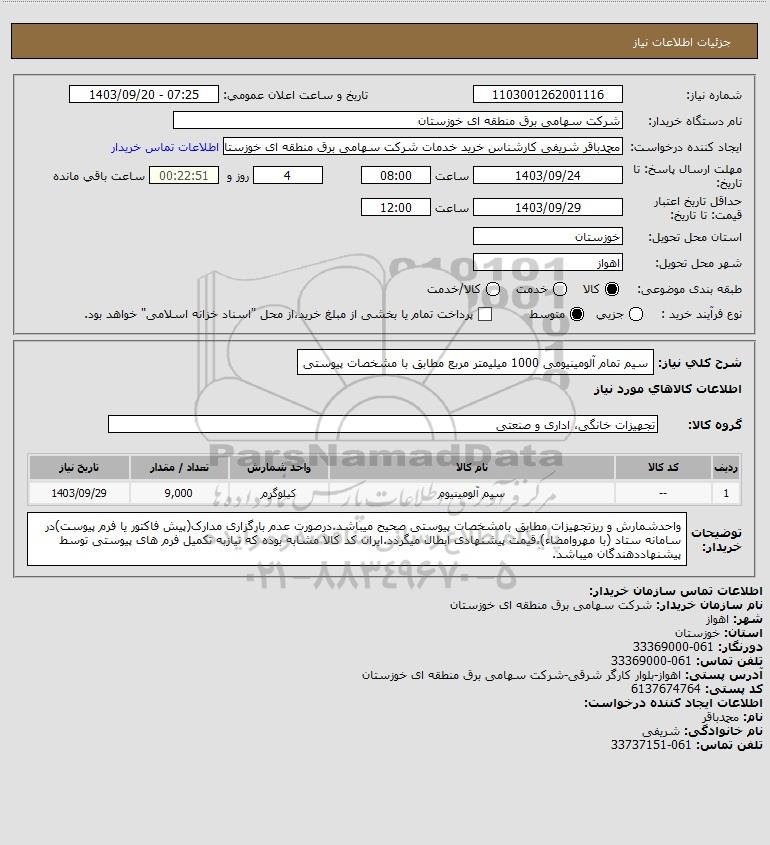 1 -- سیم آلومینیوم کیلوگرم 9,000 1403/09/29