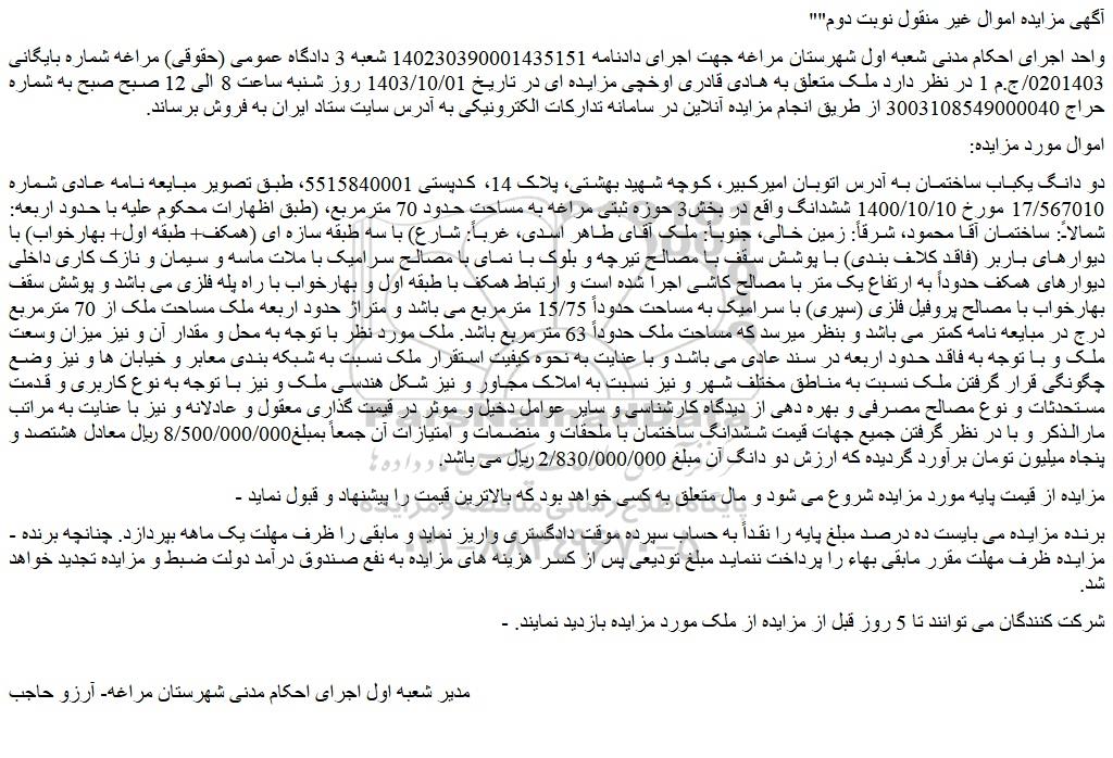 واحد اجرای احکام مدنی شعبه اول شهرستان مراغه جهت اجرای دادنامه 140230390001435151 شعبه 3 دادگاه عمومی (حقوقی) مراغه شماره بایگانی 0201403/ج.م 1 در نظر دارد ملک متعلق به هادی قادری اوخچی مزایده ای در تاریخ 1403/10/01 روز شنبه ساعت 8 الی 12 صبح صبح به شماره حراج 3003108549000040 از طریق انجام مزایده آنلاین در سامانه تدارکات الکترونیکی به آدرس سایت ستاد ایران به فروش برساند.
