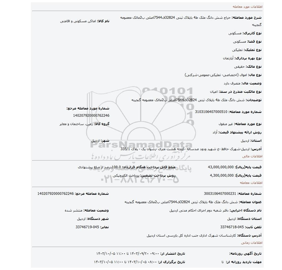 قیمت پایه(ریال): 4,300,000,000روش پرداخت تضمین: پرداخت الکترونیکی