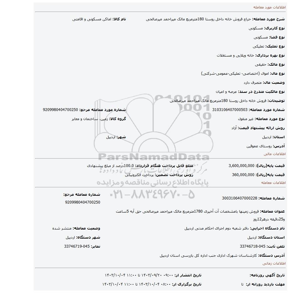 شماره مورد معامله: 3103106407000503 | شماره مورد معامله مرجع: 9209980404700250 | |