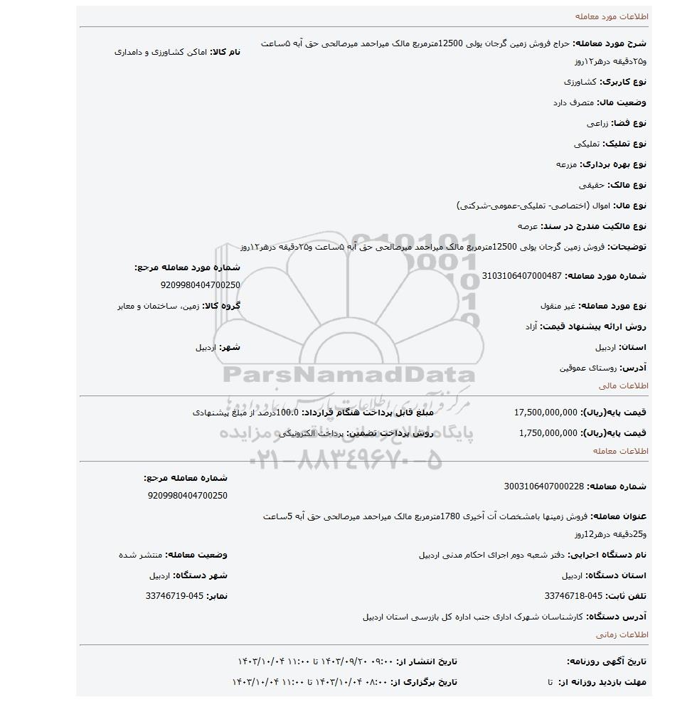 شرح مورد معامله: حراج فروش زمین گرجان یولی 12500مترمربع مالک میراحمد میرصالحی حق آبه ۵ساعت و۲۵دقیقه درهر۱۲روز | نام کالا: اماکن کشاورزی و دامداری | |