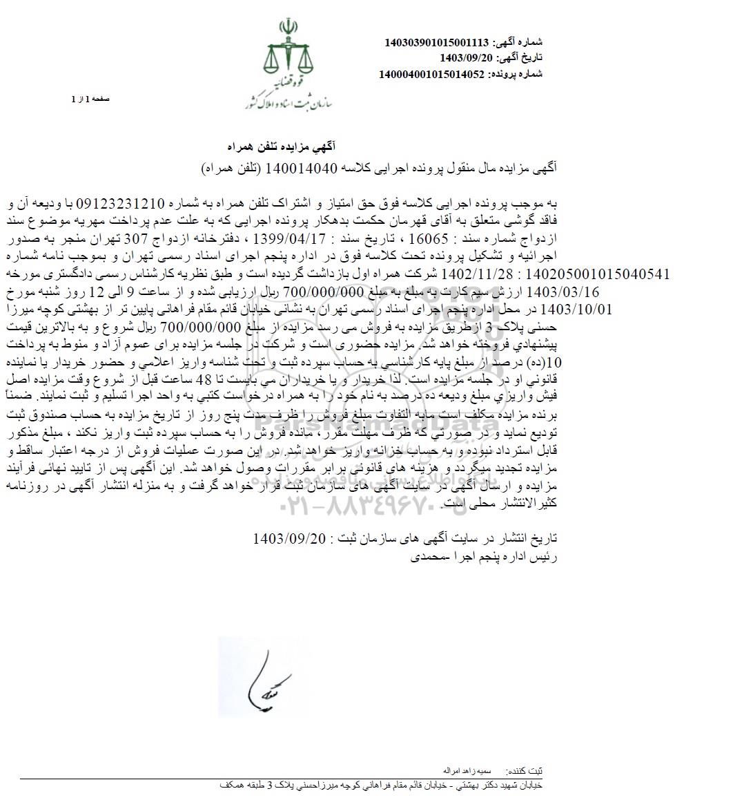 مزایده حق امتیاز و اشتراک تلفن همراه به شماره 09123231210 به ارزش 700.000.000 ریال
