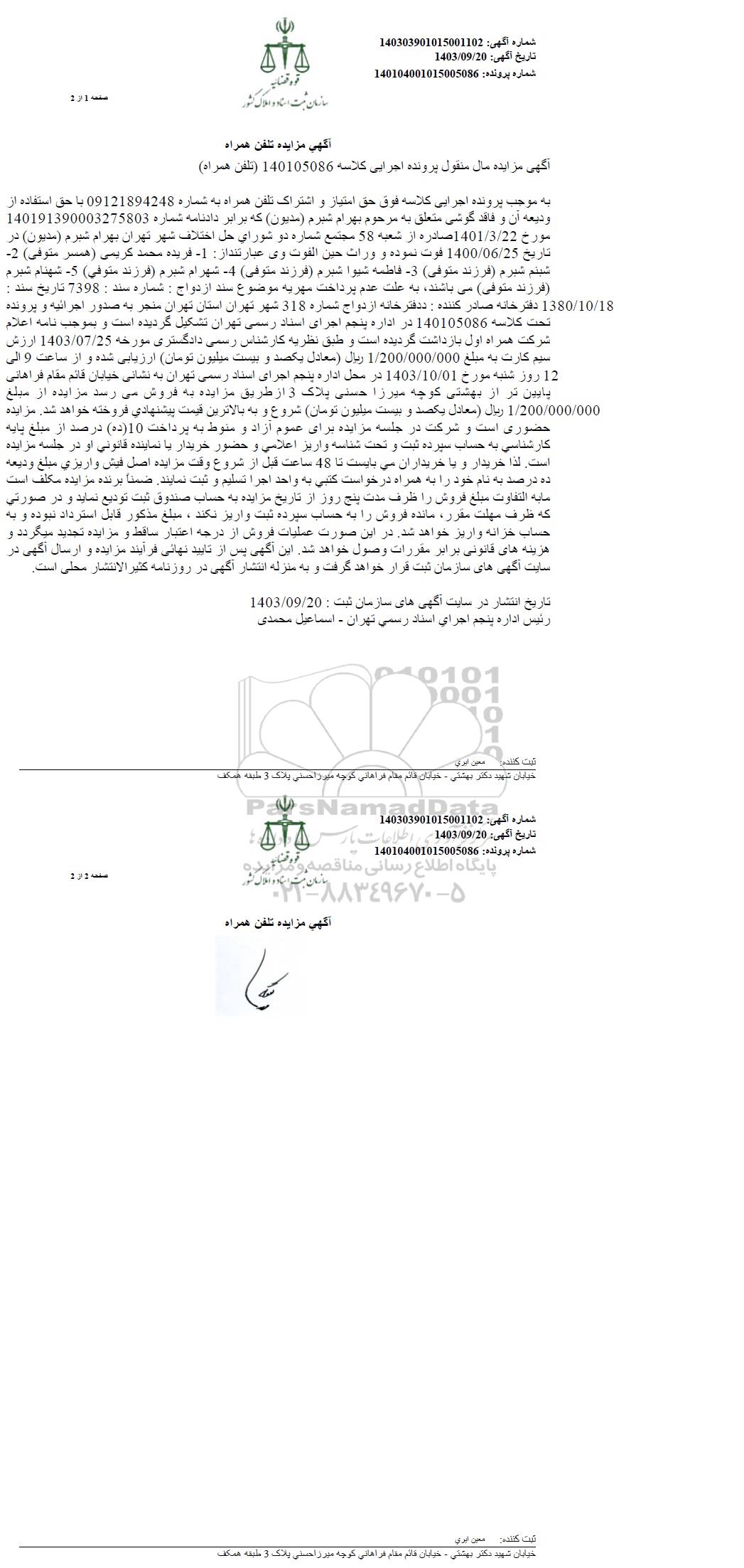 تمام آگهی ها طبق نمونه تصویر آگهی صرفا جهت اطلاع رسانی می باشد در خصوص استفاده از این آگهی هر گونه مسئولیت پرداخت به آگهی دهنده و بررسی و احراز هویت به عهده شرکت کنندگان می باشد و پایگاه خبری پارس نماد هیچگونه منفعت و مسئولیتی بابت تعهد این آگهی ندارد.