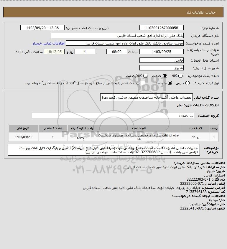 شرح کلی نیاز: تعمیرات داخلی آشپزخانه ساختمان مجتمع ورزشی کوی زهرا